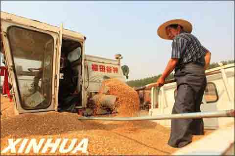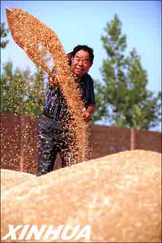 山东省即墨市段泊岚镇东瓦一村种粮大户王庆伦在装运刚刚脱粒的小麦。