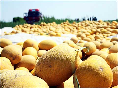 21日,以生产“金皇后”品种哈密瓜闻名的新疆五家渠市103团举办了首届甜瓜文化旅游节。随着盛夏来临,新疆的哈密瓜迎来了丰收旺季。 哈密瓜是新疆著名的特产水果。由于新疆光照充足、沙质土壤、昼夜温差大等自然条件优势,生产的哈密瓜甜度和外观都非常优质。新疆著名的哈密瓜产地有哈密、吐鲁番鄯善、托克逊、五家渠等。
