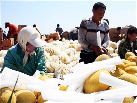 7月21日,新疆五家渠市103团的瓜农将新鲜采摘的哈密瓜打包,准备装入货车运走。
