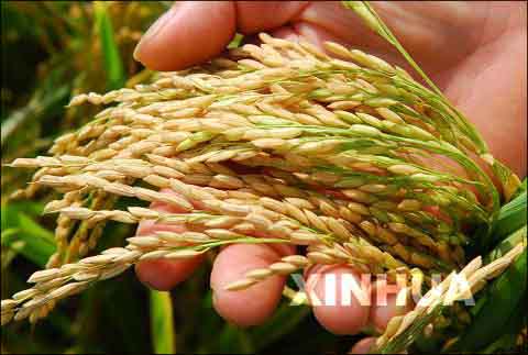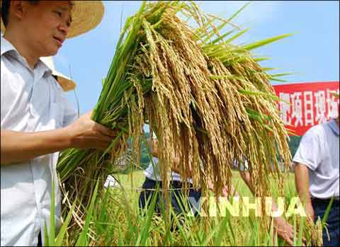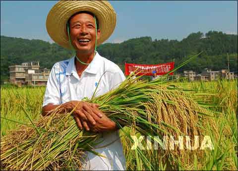 8月3日,广西昭平县庙枒村一名农民双手捧着沉甸甸的超级稻笑逐颜开。