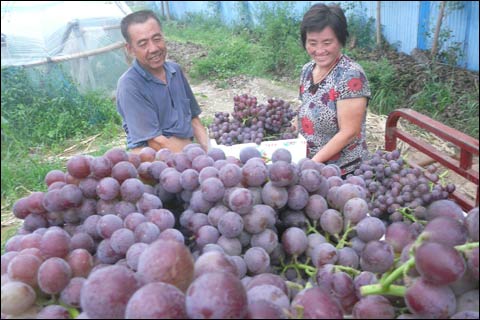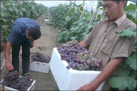 山东省聊城市开发区许营镇王庄村王殿辉夫妇,在搬运拱棚种植的“乒乓球”葡萄。