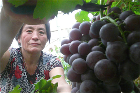 山东省聊城市开发区许营镇王庄村村民许秀喜,在采摘拱棚种植的“乒乓球”葡萄。
