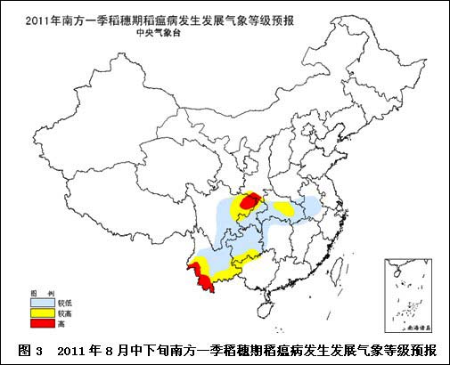 2011年8月中下旬南方一季稻穗期稻瘟病发生发展气象等级预报