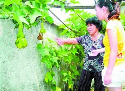 文成娥今年70岁了,在她家小院子里有个很大的丝瓜架,架子上爬满了丝瓜藤,郁郁葱葱的藤叶中露出许多大大小小的丝瓜。文娭毑说,她今年种了两个品种的丝瓜:广州丝瓜和本地丝瓜。4株广州丝瓜细细长长,与普通丝瓜无异;而5株本地丝瓜的果实则大而饱满。令人奇怪的是,其中一根藤上竟然结出了像葫芦一样的丝瓜。