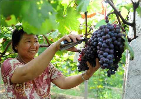 吉水县文峰镇低坪村农妇在绿色养老果园采摘葡萄