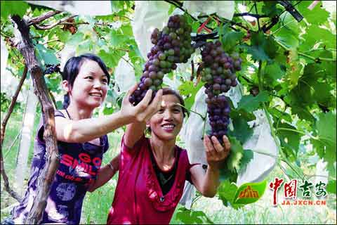 近日,吉水县文峰镇低坪村村民在绿色养老果园采摘葡萄。