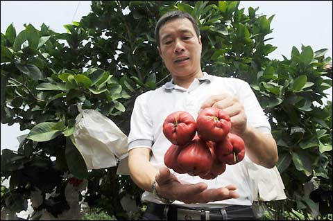 9月5日,陈俊希在向记者展示自己种植的台湾莲雾。