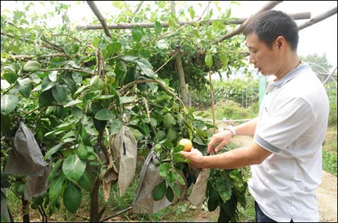 9月5日,陈俊希在查看台湾葡萄柚的生长情况。