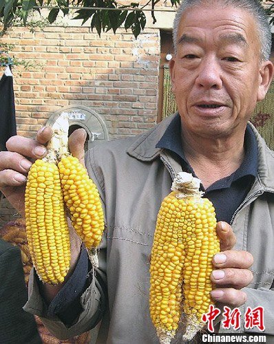 10月正值中国玉米收获季节,河北省鸡泽县小寨村村民王现立在收玉米时,发现两个外形奇特的“双胞胎玉米”:玉米总穗长与围长相等,都是23厘米;从上向下有一个变行的过程,最长行粒数36粒,穗总籽粒达888粒;籽粒金黄色,呈马齿形,成熟良好。