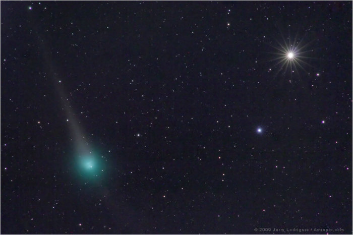 明亮的图形和鹿林彗星一同现身于狮子座,更几乎同时处于天空中与太阳相对的位置上,它们两者之间相距仅仅2度,形成了上图这幅壮丽的天文景观。鹿林彗星当时正处于近地点,距离地球大约6100万公里。这张望远镜影像同时捕捉到明亮的土星和泛绿色的鹿林彗星。看不出光环的土星吗?那是因为为了拍摄较昏暗的彗星细节,更明亮的行星被过度曝光了。右上方,土星周围有多重衍射光芒,是望远镜透镜的光圈造成的。(虞南华编译,Linq审校)