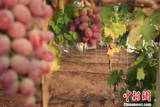 中新网甘肃张掖11月28日电 (记者 丁思 赵昕)与戈壁滩上稀疏的草木和单调的土黄色相对比,甘肃临泽戈壁滩上的大棚葡萄园里则是“春意盎然”,即将上市的葡萄挂满了枝头。“戈壁滩上的葡萄会更甜,它是民众科技致富的劳动成果,更是绿色的希望。”27日,该县种植户贾宏福接受中新网记者采访说。