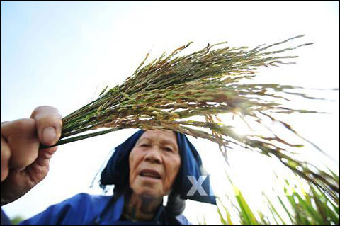 11月30日,在广西南宁市那洪街道办罗村,73岁的陆秀华老人手捧一把只有稻壳的稻穗。 新华社记者黄孝邦摄