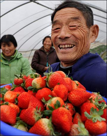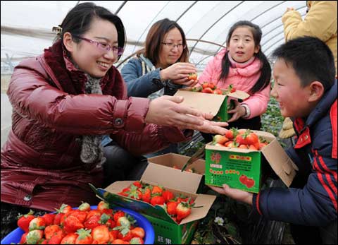 安徽舒城县棠树乡三拐村龙泉农业科技中心利用当地独特的气候和土壤特点,种植大棚无公害草莓。目前,所产草莓陆续上市,成为节前市场的靓品,引来一批批体验采摘、购销的游人和客商。新华社发(陈力摄)