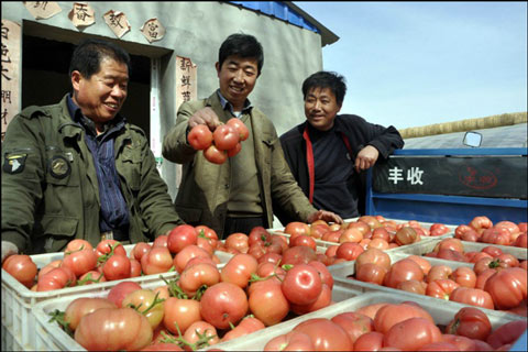 山东聊城市茌平县绿冠蔬菜农民专业合作社的社员们在高兴的采摘成熟的有机西红柿(来源:聊城新闻网)