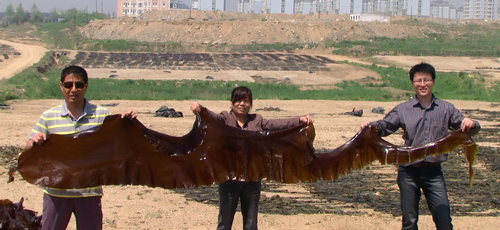 为解决栽培品种退化快、使用寿命短暂,品质下降以及苗种培育工艺中长期存在的技术问题,科研人员与山东荣成市蜊江水产有限责任公司合作,通过海带、裙带菜地理隔离种群,利用克隆技术进行品系杂交组合,在培育后的子一代中筛选经济性状优良的杂交后代。新品系“202”、“205”具有遗传稳定、抗逆性强、高产、褐藻胶和碘含量高等特点。其中,“202”品系为晚熟品种,具有藻体宽、长,抗病烂等优良品质,适宜5月~7月份收割。“205”品系为早熟品种,具有藻体厚、含水量少、成熟早等特性,适宜4月~6月份收割。两个新品系均比比老品种增产10%以上。