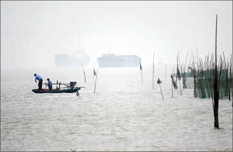 7月1日,江苏镇江渔民在长江里作业。新华网(陈岗摄)