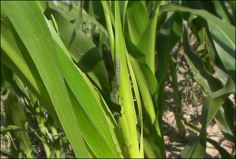 (三)建封锁带,防止转移。在粘虫迁移危害时,可在其转移的道路上撒成15厘米宽的药带进行封锁;或在玉米田亩用40%辛硫磷乳油75~100克加适量水,拌砂土30公斤制成毒土撒施进行隔离。