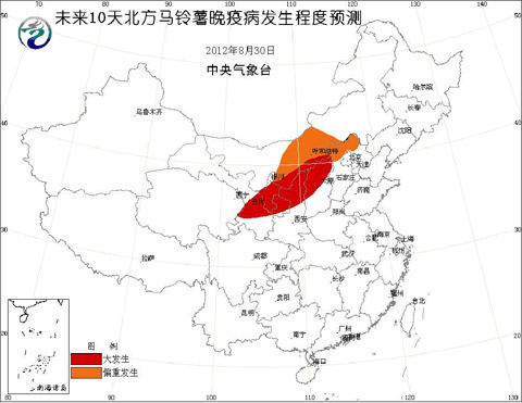 预计未来10天,北方地区将有两次降水过程,分别是8月31日至9月2日和9月6至8日。由于降水多、田间湿度高,十分有利于马铃薯晚疫病的扩散流行,加之前期病原基数高,未来10天,甘肃东部、宁夏大部、陕西北部、山西北部马铃薯晚疫病仍将大发生,内蒙古中部和河北北部偏重发生。