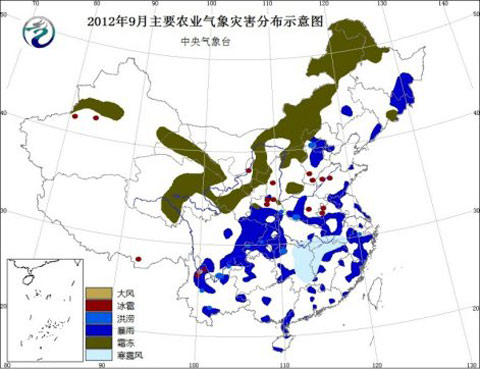 西南地区东部、江淮、江汉等地强降水造成部分农田被淹。月内,黄淮南部、江淮、江汉、江南、西南地区东部和南部等地出现强降水,导致部分低洼农田被淹、被毁,部分作物倒伏,对秋收作物后期生长和已成熟作物收晒不利。据统计,四川9月10日区域性暴雨天气过程造成农作物受灾近37千公顷。9月11日、12日的暴雨导致重庆市南川区水稻、蔬菜等农作物受灾745.3公顷;湖南省湘西土家族苗族自治州龙山县农作物受灾面积5.5千公顷,农林牧渔业直接经济损失0.972亿元。云南省玉溪市通海县9月12日至13日暴雨造成全县农作物受灾面积2.1千公顷,沟渠损坏167米。山东青岛胶南市9月21日受暴雨影响造成农作物受灾面积1.5千公顷,损坏熟果蔬菜大棚、养殖大棚等130个,冲毁养殖池10个,农业直接经济损失约2810万元。