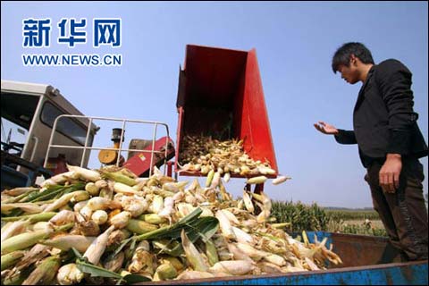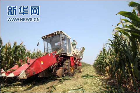 10月1日,一台玉米收割机在山东省临沂市郯城县郯城街道高西村收获玉米。 新华社发(张春雷摄)