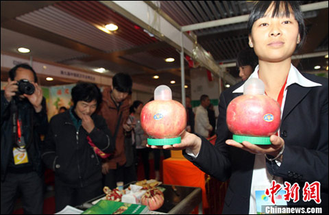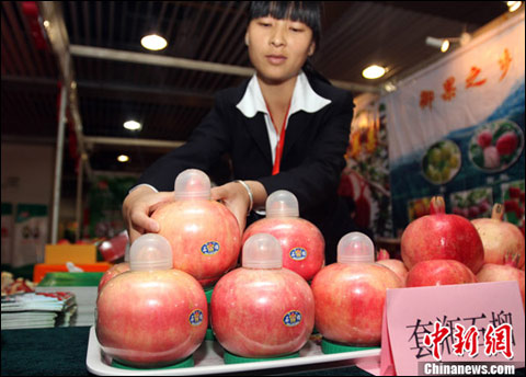 11月2日,一参展商展示的果品石榴“穿衣戴帽”,吸引不少参观者的目光。(中新社发 张畅 摄)