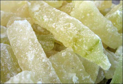 配料比例:鲜瓜50公斤,糖粉2.5公斤,白砂糖30公斤。选用老熟的鲜冬瓜,去皮及内瓤,剖开切成长8~9厘米、宽1厘米的长方条,然后置于缸中。另取石灰250克加入微温水溶化后,将切好的瓜条投入浸1夜,次早捞出瓜漂洗干净。操作时先用清水10公斤烧开,加入瓜条煮20分钟,捞出沥干,冷却后备用。最后,加糖煮制,即用清水3公斤烧沸后,将30公斤白砂糖分4次加入煎煮,每次相隔30分钟。煮沸后将瓜条放进,煎至糖已浓缩将干、瓜条转硬变固时,即可离火起锅,置于放有糖粉的竹箩上抖匀,然后摊开晾晒半天即为成品。