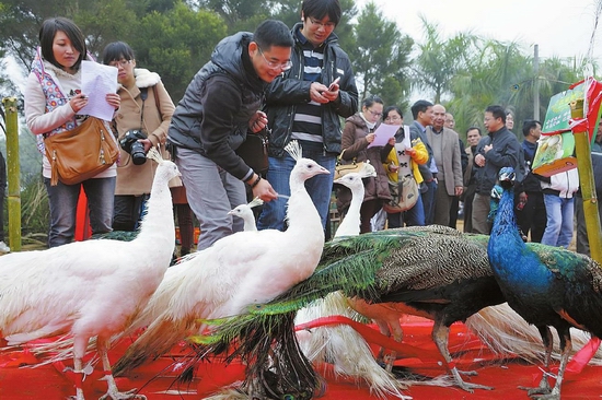 今年5月,市民将可以到良庆区南晓镇 “白鹭村”一睹印度国宝级珍稀禽———蓝孔雀的尊容。1月24日上午,沃·德星国际生态度假庄园项目一期工程———孔雀生态养殖基地在“白鹭村”正式开工。据了解,孔雀生态养殖基地是广西首个蓝孔雀养殖基地,占地300余亩,将在3个月内建成,并投放养殖1万只蓝孔雀。届时,将成为全国最大的蓝孔雀养殖基地。