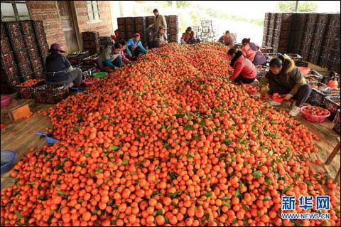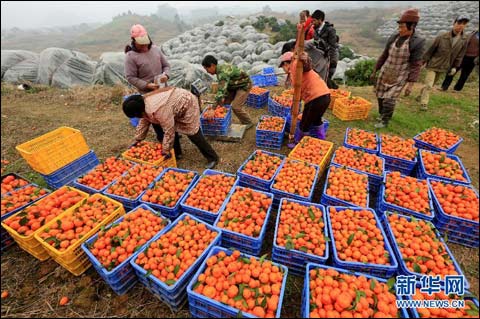 2月13日,果农在广西柳州市融安县潭头乡龙城村果园里搬运蜜桔。(谭凯兴 摄)