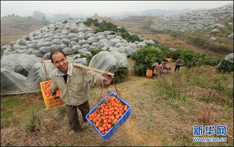 2月13日,在广西柳州市融安县潭头乡龙城村,果农将刚采摘的蜜桔挑出果园。(谭凯兴 摄)
