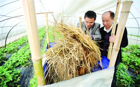 农产品要达到“绿色无公害”标准,不管是土壤、化肥、农药还是光照、二氧化碳含量都有严格要求,生长的每个环节需要有专门的技术指导。殷国海介绍说,“品天下”的产品在开种前,田里的泥土都要经过生翻、暴晒。大棚扣膜封闭后,还利用晴天中午高温闷棚,用物理方法对温室进行彻底的播前消毒。首批开种30亩草莓所用的200吨肥料,是公司花了8万元从附近农场购买的禽畜粪便,又通过加入微生物菌发酵制成的,产品从播种、施肥、防病虫害等各方面全采用生物技术,没有任何添加剂,从源头上确保产品质量。