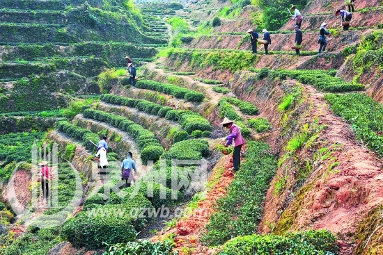 茶农们正忙着在茶园的梯壁、堤埂上套种黄花菜。 (吴承接/摄)