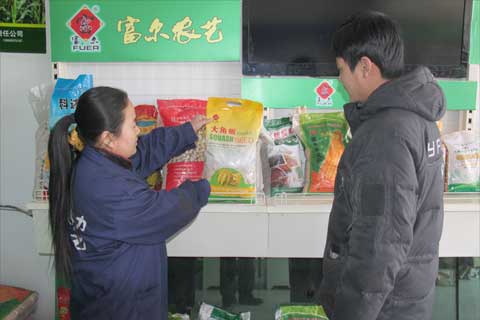 图为农民在扎兰屯市富尔农艺连锁加盟店购买种子