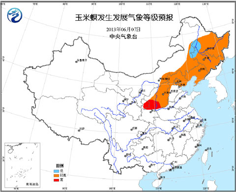 预计6月北方春玉米产区气温接近常年同期略偏高,大部有50~100毫米降水,其中西北地区东部降水量较常年同期偏多,春玉米主产区大部气象条件对玉米螟发生发展较为有利。根据玉米螟发生发展气象条件和气象等级预测模型结果综合分析,预计2013年6月中下旬,吉林西部、黑龙江西南部等地玉米螟发生发展气象等级低,东北地区大部、河北北部、京津地区、山西大部等地玉米螟发生发展气象等级较高,陕西中部、山西西南部和甘肃陇东等地玉米螟发生发展气象等级高,玉米螟偏重发生的可能性较大。