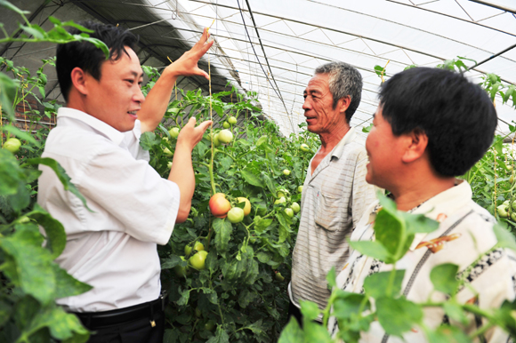 农技师高学军(左)为菜农讲解佳粉8号番茄管理技术