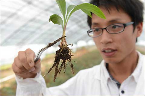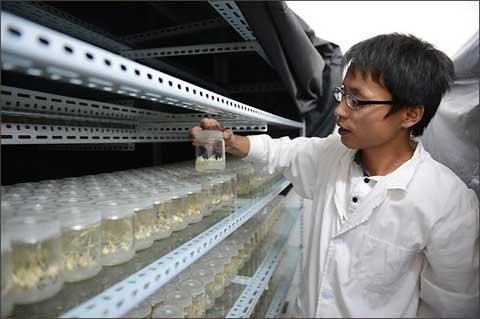 河北省平泉县种苗站与中国农科院合作,2009年启动百合脱毒种球组织培养试验项目。截至目前,已经成功组培百合原种球8.5万粒,进入大田试种的种球周径已达14至16厘米,且长势良好。百合脱毒种球的繁育成功不仅提高了花农种植效益,还打破了我国百合种球长期依赖进口的局面。(新华社记者王民摄 新华网)