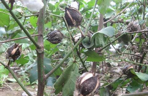 5.及时防治病虫害。棉铃虫、玉米螟等危害棉铃后形成孔洞,雨水灌入引起烂铃。病菌引起的烂铃,多发生在植株下部的1-5果枝、铃期40天以上的大铃上。及时防治病虫害,减少棉铃伤口,避免病菌和雨水浸染,可有效减轻烂铃。烂铃发生初期(烂铃植株达0.1%)喷药防治效果良好,如果烂铃发生较重时再喷药,效果就很差。可选用百菌清75%可湿性粉剂600倍液、或50%多菌灵可湿性粉剂500倍液、或40%乙磷铝可湿性粉剂300倍液、或1∶1∶200倍波尔多液进行田间喷洒,每亩每次喷洒药液45~60公斤。要对准棉株中下部的青铃喷洒均匀,间隔6~8天再喷洒一次,连喷2~3次,防治效果在86%左右。喷药前,采摘吐絮棉铃,避免因喷药而降低纤维质量。可结合防治第4代棉铃虫,在杀虫剂中加入防烂铃的杀菌剂,这样既防治害虫,又能预防烂铃。