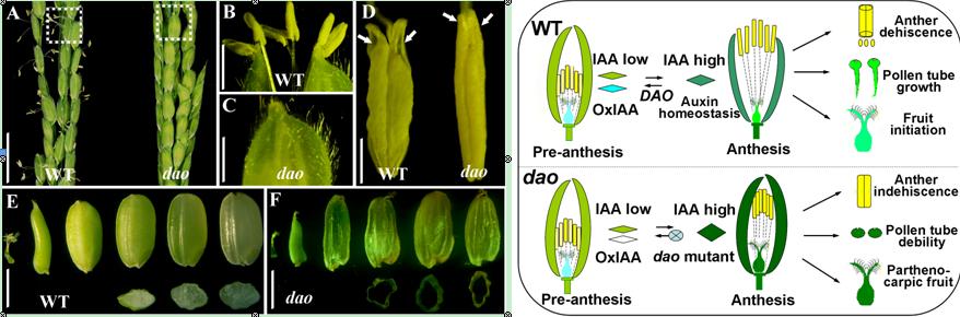 万建民课题组在前期研究中筛选到一个突变体材料,发现其在营养生长期与野生型没有明显的差异,但在开花期可导致突变体植株单性结实。科研人员精细定位和图位克隆了该基因,命名为DAO(Dioxygenase for Auxin Oxidation)。进一步研究发现,通过外源激素处理和促进内源激素含量增加均能使野生型植株表现出突变体的表型,体外酶活试验和体内激素含量的测定都证实DAO蛋白能够氧化生长素IAA为OXIAA,从而维持体内IAA的动态平衡。该结果首次报道DAO通过调控植物激素IAA的代谢来严格控制水稻的生殖发育过程(见下图)。