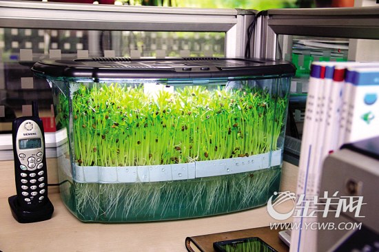 日前,记者走访珠江新城一家广告公司,看见茶水间的茶几上放着一个外形像金鱼缸的箱子,里面“种”着绿油油一片菜苗。“这是葵花子苗,市面上很少见,过两天就可以收割了。”该公司白领阿浩不无得意地说,他就是负责打理的“菜农”。