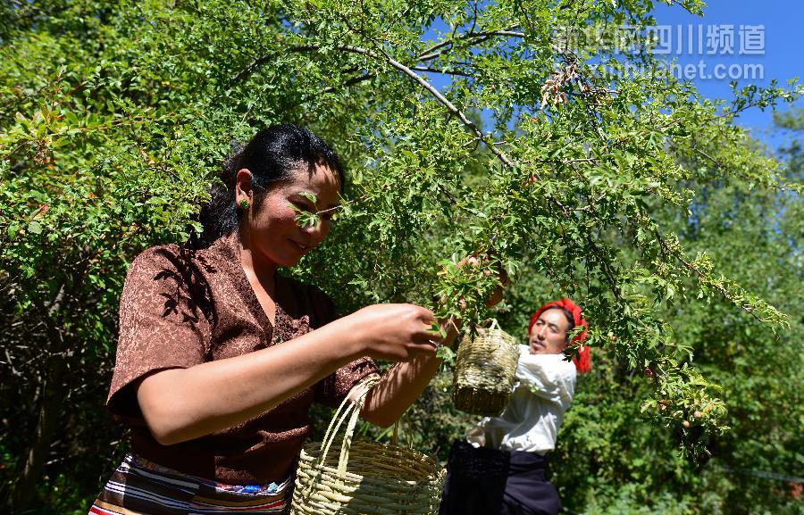 8月20日,四川省炉霍县斯木乡瓦达村农民在采摘用于制作俄色茶的鲜叶(新华社记者 江宏景 摄)