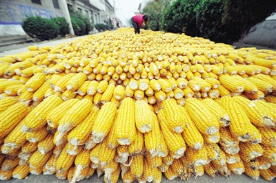 记者从农业部了解到,从各地田间测产和实打实收情况看,秋粮丰收已成定局。加上已增产到手的夏粮和早稻,全年粮食产量有望再创历史新高,实现新中国成立以来首次连续十年增产。(图为在山西运城市新绛县三泉镇水西村,一名农民在堆放玉米。新华社发)