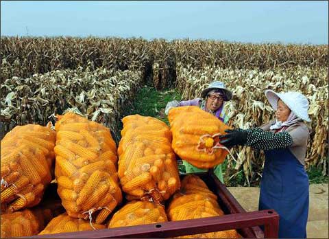 云南宣威市板桥镇大耿屯村的农妇在搬运刚收的玉米(10月15日摄)。