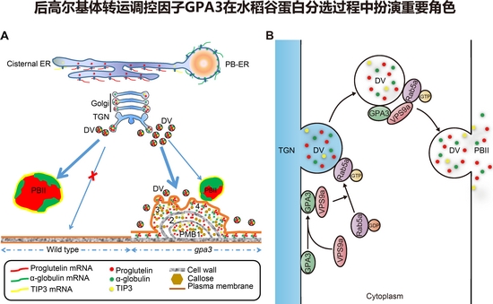 研究表明,gpa3是一个贮藏蛋白后高尔基体分选缺陷的突变体。通过图位克隆,万建民团队分离了位于“水稻第3号”染色体长臂末端的GLUTELIN PRECURSOR ACCUMULATION3(GPA3)基因,该基因编码一个植物特有的含有Kelch-repeat基序的蛋白质—GPA3蛋白;后续的功能研究发现,GPA3蛋白可与该科研团队报道的两个功能因子GPA1/Rab5a和GPA2/VPS9a形成一个功能蛋白复合体,协同调控贮藏蛋白的定向运输(见下图)。