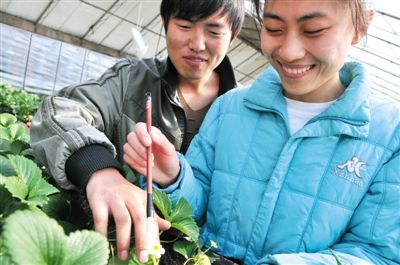 23日,在工作人员的指导下,市民肖女士手拿着一支毛笔,在草莓花蕊外侧的雄蕊上扫上一圈,再在花瓣最中间凸起的雌蕊抹了抹,完成了给草莓授粉的过程。