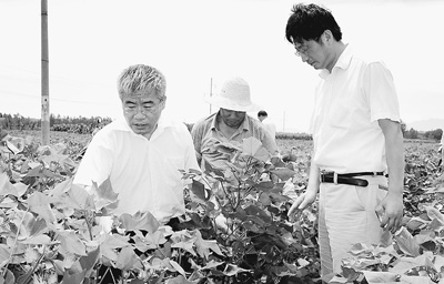 2013年,张献龙(左一)考察长江流域高温对棉花生产的影响。资料图片