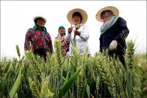 5月14日,在山东省郯城县一小麦良种繁育基地,郯城农业局农技推广员高建玲(右二)在为麦农讲解小麦良种去杂要点。