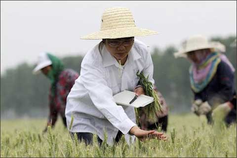 5月14日,在山东省郯城县一小麦良种繁育基地,郯城农业局农技推广员高建玲(中)在检验小麦良种去杂后的纯度。