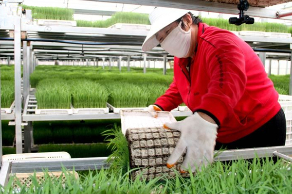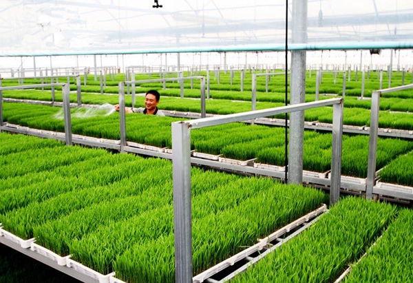 江苏金桥盐化集团青口盐场是连云港第一个工厂化水稻温室育秧中心,去年投产以来,为2000多亩水稻提供高效秧苗。水稻温室育秧中心育苗一般先在玻璃温室中培育5天,然后秧盘被移到大棚内“炼苗”,大概5至7天后,秧苗培育完成,便可进行机插,整个过程较传统育秧缩短10天左右。此外,与大田育秧相比,温室育秧可大幅节省秧田面积,能科学控制和调节秧苗生长过程中的光照、水分、湿度等,提高秧苗的存活率。(新华网江苏频道)