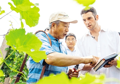 2009年、2008年,诺博和汉斯两位专家相继离世,诺博先生的外孙马克·林顿接过中德友谊的接力棒,继续外祖父在山亭区葡萄种植及酿酒事业。图为5月31日,德国葡萄专家马克·林顿(右)在山东省枣庄市山亭区汉诺庄园酿酒葡萄种植园向地方村民传授技术。(本报记者 魏东 本报通讯员 刘明祥摄影报道 科技日报)