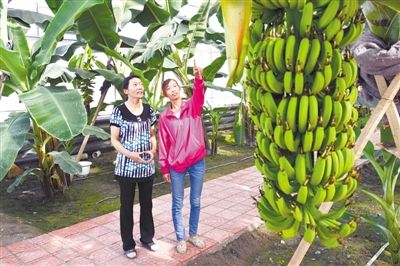 近日,新疆建设兵团二十九团农业技术人员利用日光智能温室种植的60多棵香蕉树全部成活,相继挂果的香蕉树,吸引了众多农民前去观赏取经。这一创新技术为大西北干旱地区栽培南方水果探索出了一条新路。(科技日报 杜炳勋/摄)