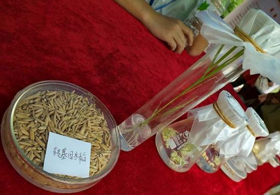 2014年5月16日,湖北省第十四届科技活动周开幕式在宜昌市夷陵广场举行,来自华中农业大学的科技人员展示的转基因水稻。